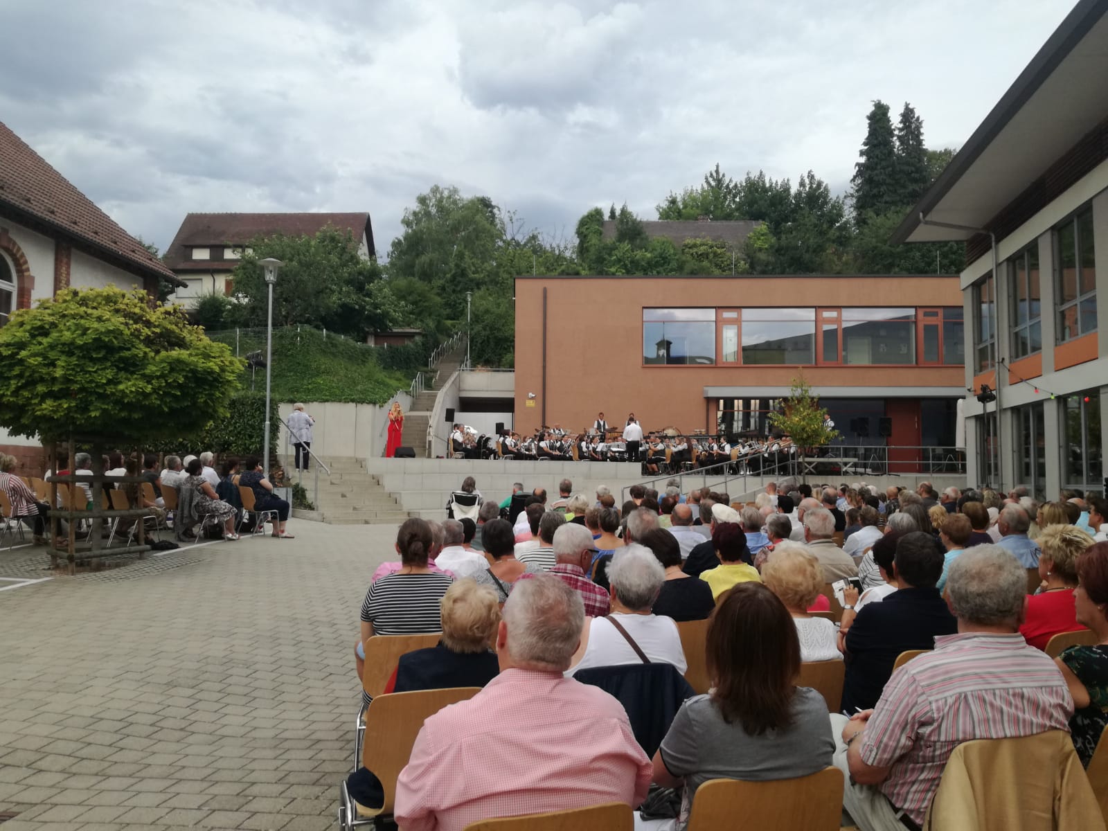 Die Stadtkapelle Ettenheim hatte am 20. Juli 2019 zu einem Konzerterlebnis der besonderen Art eingeladen. Mitreißende Klassiker der Popgeschichte, Swing- und Filmmusik, gesungen von der bezaubernden Verena Ruder und begleitet von der Stadtkapelle Ettenheim im Hof des Städtischen Gymnasiums. Die passionierte und studierte Sängerin Verena Ruder aus Freiburg wurde bereits mehrfach für ihr Talent ausgezeichnet, Liedern der unterschiedlichsten Musikgenres einen einzigartigen Charakter zu verleihen. Im Rahmen der Goldenen Künstlergala in Filderstadt wurde sie in der Sparte Piano und Gesang zur Künstlerin des Jahres 2017 gekürt. Simon Kapp, der bei seinem Debüt als Moderator der Stadtkapelle beim letztjährigen Jahreskonzert bereits das Publikum begeisterte, wird Sie auch bei diesem Konzert mit kurzweiligen Geschichten und Anekdoten durch den Abend führen und auch selbst zur Gitarre greifen und mitsingen, zum Beispiel bei „Something Stupid“ aus den 60er Jahren.