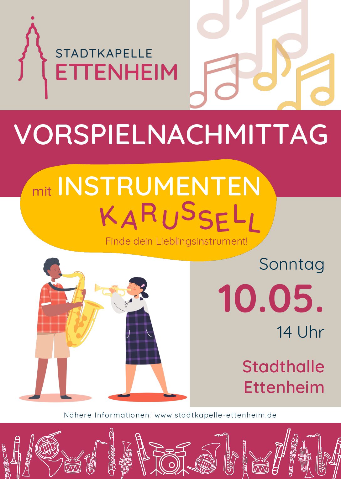 Am Sonntag, den 10.05.2026 um 14 Uhr lädt die Stadtkapelle zum Vorspielnachmittag mit Instrumentenkarussell in die Stadthalle Ettenheim ein.