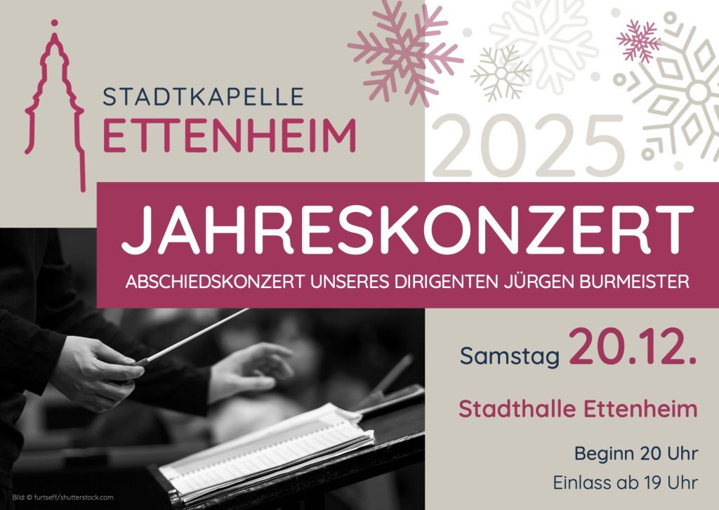 Unser vorweihnachtliches Jahreskonzert der Stadtkapelle Ettenheim – es ist gleichzeitig auch das Abschiedskonzert unseres langjährigen Dirigenten Jürgen Burmeister – und des Jugendorchesters der Stadtkapelle, dirigiert von Christian Sade findet am Samstag, den 20. Dezember 2025 in der Stadthalle Ettenheim statt.
