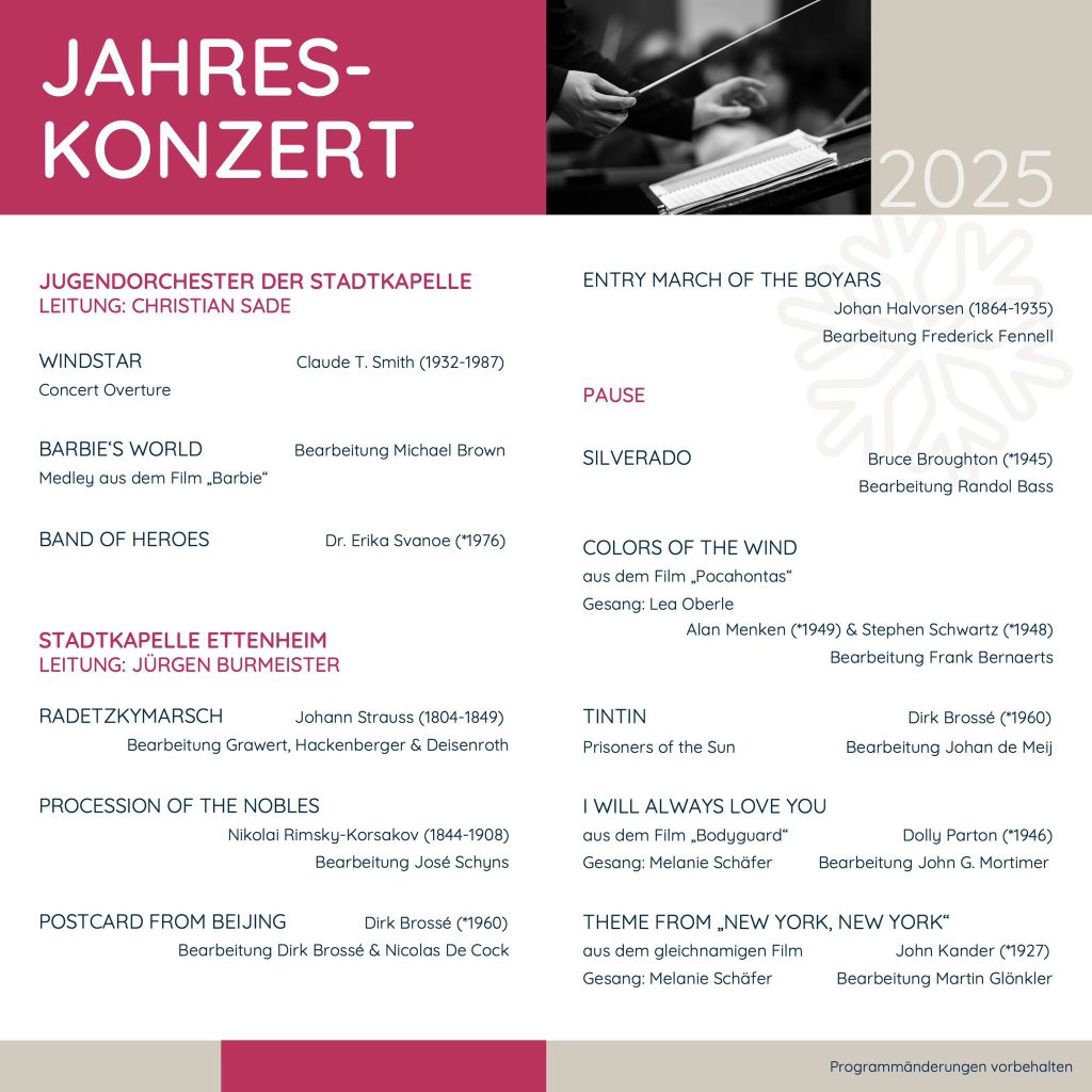 Ein Höhepunkt im Programm der Stadtkapelle ist das Stück „Silverado“ von Bruce Broughton. Der mitreißende Haupttitel aus dem gleichnamigen Westernfilm macht Lust auf Abenteuer. Eher zart, und mit einer immer aktuellen Botschaft kommt „Colors of the wind“ daher – der wohl bekannteste Song aus dem Film „Pocahontas“, gesungen von Lea Oberle. Die Geschichten von „Tintin“ werden den meisten wohl eher unter dem Namen „Tim und Struppi“ bekannt sein. Der belgische Reporter Tim reist in der Comic-Serie um die Welt – so abwechslungsreich und aufregend klingen auch die Melodien im Stück „Prisoners of the sun“. Zum Abschluss nimmt das Orchester das Publikum gemeinsam mit Sängerin Melanie Schäfer mit nach Hollywood. Mit „I will always love you“ aus dem Film „Bodyguard“ und „New York, New York“ geht das Abschiedskonzert feierlich zu Ende.